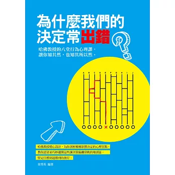詳細資料ISBN:9789869255615 叢書系列:大眾心理叢書 規格:平裝 / 320頁 / 25K正 / 14.8 X 21 CM / 普通級/ 單色印刷 / 初版 出版地:台灣 內容簡介本書特色 本書運用通俗易懂的故事和案例,有針對性地講解了溝通中的實戰技巧和方法。閱讀本書,可以從日益增長的自信和熱忱中,得到生活的力量,增進溝通能力,學會為人處世的技巧。 掌握了「做決定」聽起來只是一個簡單的行為,可是它卻像人生的陷阱和誘惑一樣,時常讓我們猶豫不決,最終做出錯誤的決定。 難道就沒有什麼方法可以幫我們走出做錯決定的困境嗎?哈佛教授的八堂行為心理課將給我們最好的答案。在本書中,你能夠從行為學和心理學角度去瞭解人們是如何做錯決定的;決定本身是一種怎樣的過程;有沒有什麼方法可以避免做錯決定;做決定之後我們又該如何進行修正和彌補……各種你所關心的問題,都能從本書中找到答案。編輯推薦 ★哈佛教育研究學者、百萬暢銷書《哈佛凌晨四點半》作者韋秀英新著。 ★凝聚哈佛智慧精華,學習精英心理品質。 ★一看就懂、一學就會的行為心理術! ★讓你知其然,也知其所以然。 |